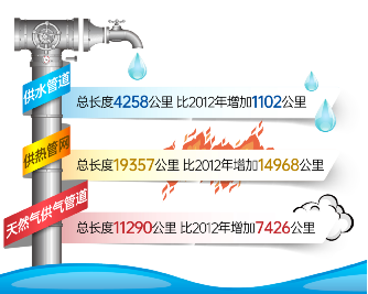 基础设施建设成绩斐然。2021年末,全市公路网总里程达到 13189.4公里,比2012年增加1041.7公里。其中,高速公路里程达到671.6公里,实现了县县通高速;二级以上公路 2926.2公里,占比达到22.2 %。全市供水管道总长度4258公里,比2012年增加1102公里,供水量6.8亿立方米,比2012年增加1.2亿立方米。供热管网总长度19357公里,比2012年增加14968公里,供热总面积4.1亿平方米,比2012年增加1.7亿平方米。天然气供气管道总长度11290公里,比2012年增加7426公里。城市公交运营车辆6262辆,比2012年增加1030辆;运营线路332条,比2012年增加126条;公交运营线路长度达到5424公里,比2012年增加1467公里。地铁运营线路4条,比2012年增加2条;运营里程1381.7万列公里,比2012年增加948.3万列公里;客运量38378.4万乘次,比2012年增加19952.2万乘次;在建线路5条,里程长度140公里,车站100座。有轨电车全年运营里程290.4万列公里,客运量771.3万人次。
